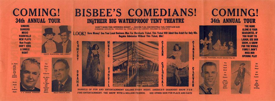 In 1956, Bibee's Comedians were acquired by Billy Choate, grandson of William Carroll Choate, founder of Choate's Comedians. Billy had been traveling with the Bisbee's since 1942.