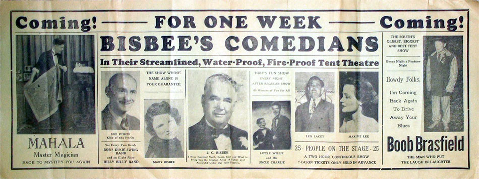 The route of the Bisbee's Comedians: Lexington TN, Parsons TN, Linden TN, Hohenwald TN, Dickson TN, Waverly TN, Camden TN, Bruceton TN, McKenzie TN, Murray KY, Benton KY, Fulton KY, Clinton KY, LaCenter KY, Smithland KY, Kuttawa KY, Eddyville KY, Marion KY, Morganfield KY, Princeton KY, Dawson Springs KY, Calhoun KY, Owensboro KY, Livermore KY, Hartford KY, Fordsville KY, Leitchfield KY, Morgantown KY, Greenville KY, Russelville KY, Elkton KY, Hopkinsville KY, Cadiz KY, Union City TN, Martin TN, Dresden TN, Dyer TN, Obion TN, Dyersburg TN, Halls TN, Ripley TN, Covington TN, Brownsville TN, Whiteville TN, Somerville TN, Moscow TN, and Collierville TN.